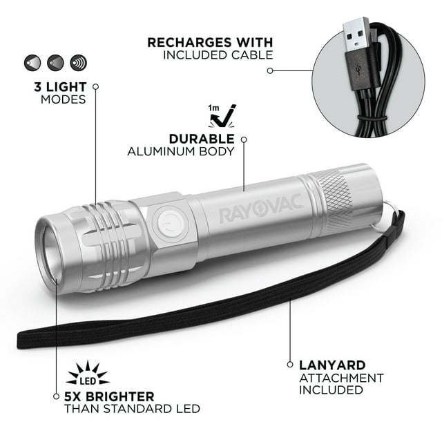 One (1) Rayovac Value Metal Rechargeable LED Flashlight with one included micro USB charging cable