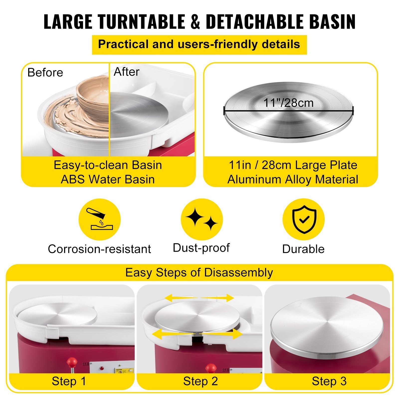 1.11" Aluminum Alloy Wheel: 11" / 28 cm large aluminum alloy turntable allows users to draw large pieces quickly. Besides, an enclosed water basin prevents mud from eroding and penetrating the fuselage. Moreover, it is detachable for easy cleaning.