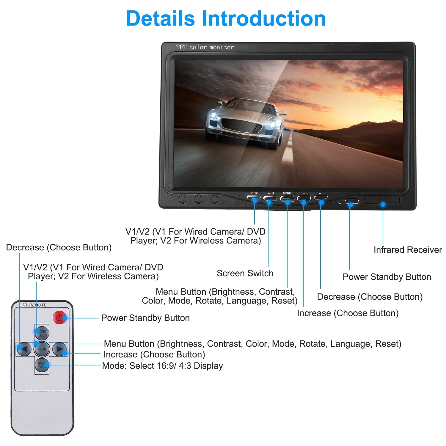*Wireless & Remote Control*:Come with wireless monitor and reverse camera; just connect the power then choose V2 and the according frequency "2307" to finish wireless connection between monitor and camera. No other messy cables needed; more convenient and simple. Besides; antenna can be added to enhance signal. With a remote controller; easy to turn on/off the monitor and set different modes with no use reaching for the monitor.